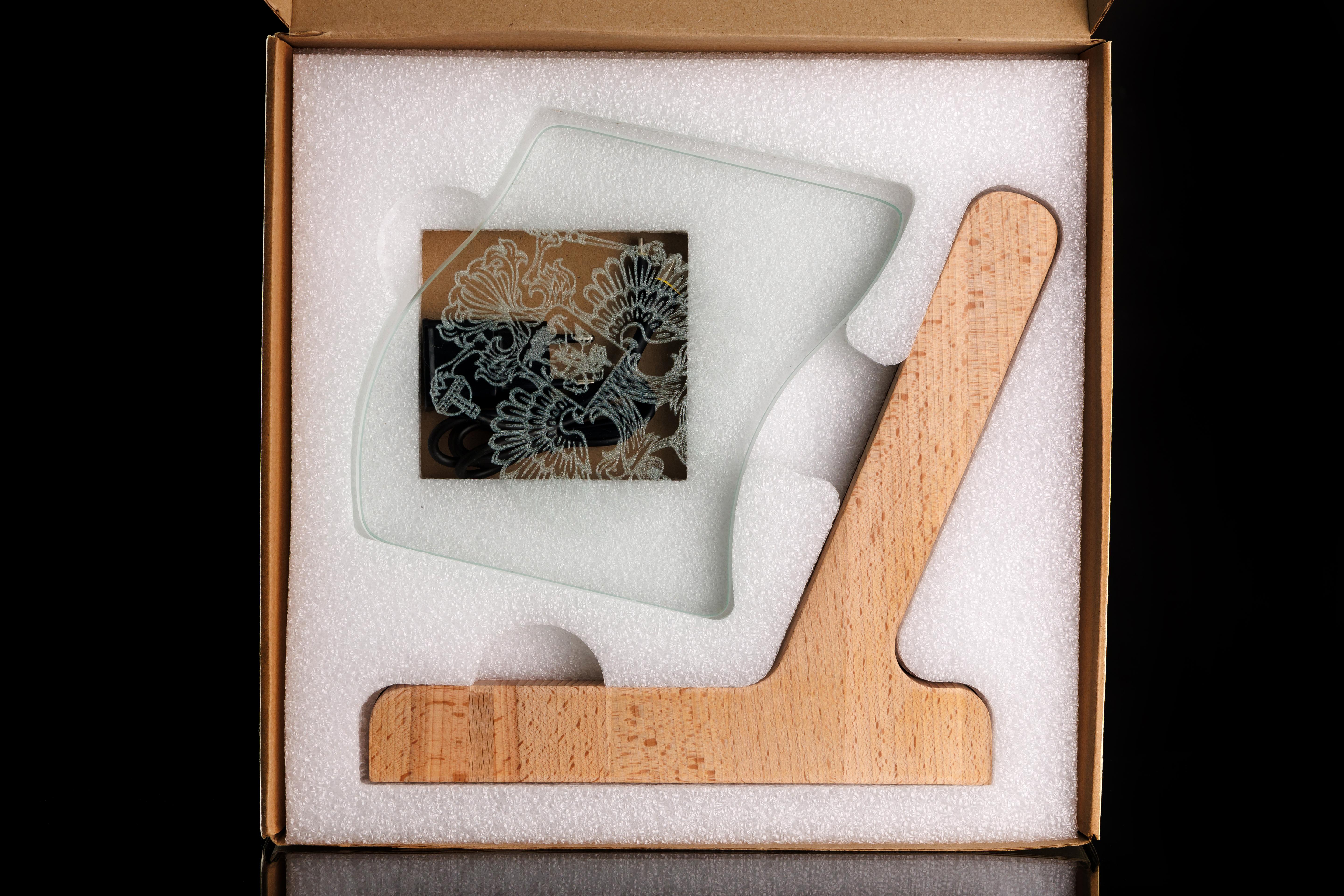 Размеры подставки - высота 24 см, длина 28 см, ширина 5 см Размеры стекла - 18х18 см Управление подсветкой касанием (скрытая бесконтактная кнопка). Размеры коробки 31.5х31.5х6 см Состав упаковки - подставка, стекло с рисунком, блок питания с проводом usb type-c.