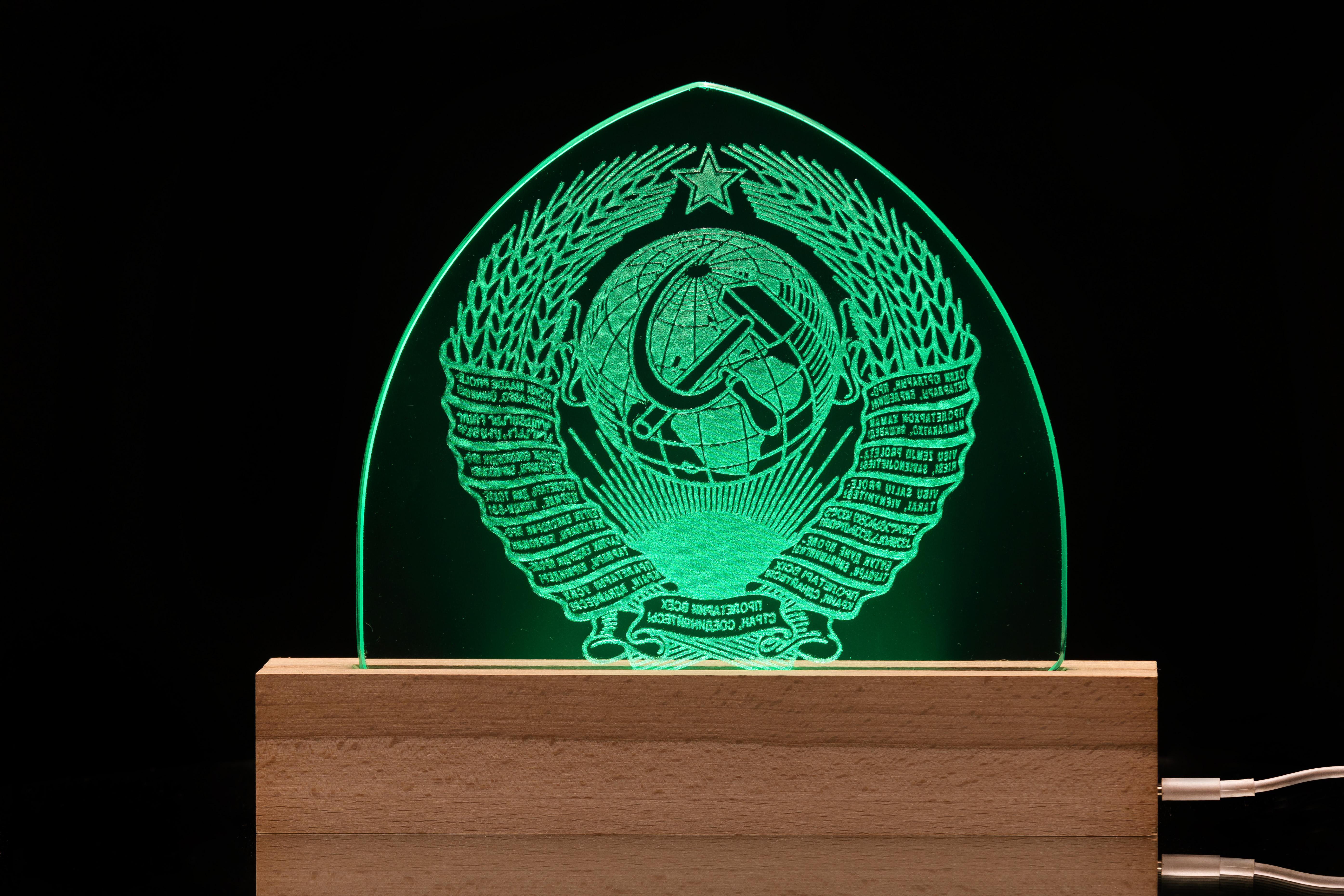 Настольный подарочный светильник с гравировкой герб СССР. Подарите свет, эмоции и память! Мы превращаем стеклянный светильник в уникальный сувенир с гравировкой. Идеальный подарок для друга, парня, мужчине, брату, сыну, подруги, сестры, дочери, мамы, жены или коллеги. Подходит для любого события: день рождения, юбилей, свадьба, новоселье, 8 марта, 14 февраля, 23 февраля, Новый год или просто без повода. Ночник с 10 вариантам цветов и 3 режимами автоматической смены цветов создаёт волшебную атмосферу. Позволяет подобрать идеальный свет для любой комнаты. Питание — USB TYPE-C кабель и блок питания в комплекте. Подставка изготовлена из натурального дерева, что обеспечивает устойчивость и стильное оформление. Ночник выполнен из настоящего стекла 12 мм — триплекс с рисунком внутри, который не мутнеет, не искажается. Управление светильником осуществляется через сенсорную кнопку, а питание от USB (включая зарядку от телефона). Каждый светильник упакован в коробку с мягким ложементом и готов стать запоминающимся сюрпризом. Лазерная гравировка остаётся яркой и чёткой, а стекло — безопасное и долговечное. Дарите свет и незабываемые эмоции, которые остаются в памяти. Размеры и состав светильника: • Размеры подставки - высота 4,5 см, длина 25 см, ширина 5 см • Размеры стекла - 19х19 см • Управление подсветкой касанием (скрытая бесконтактная кнопка). • Размеры коробки 32х32х6 см • Состав упаковки - подставка, стекло с рисунком, блок питания с проводом usb type-c.